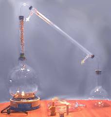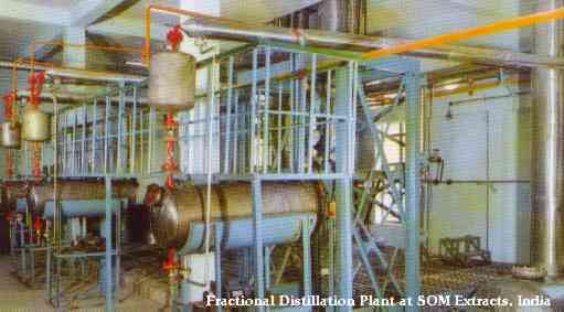 Commercially the process most commonly used to isolate chemicals from essential oils is called "fractional distillation" The material is heated (maybe under vacuum) and the vapor rises into a long column above the still. The column is filled with many objects on which the vapor can repeatedly condense and reevaporate as it moves toward the top, effectively distilling the vapor many times. The less volatile substances in the vapor tend to run back down the column after they condense, concentrating themselves near the bottom. The more volatile ones tend to re-evaporate and keep moving upward, concentrating themselves near the top. Because of this the column can be tapped at various levels to draw off different fractions. |