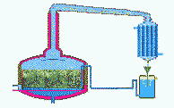 . The steam passes through the plant material and carries the essential oil out of the tank into a condenser [-5'c]. The steam condenses